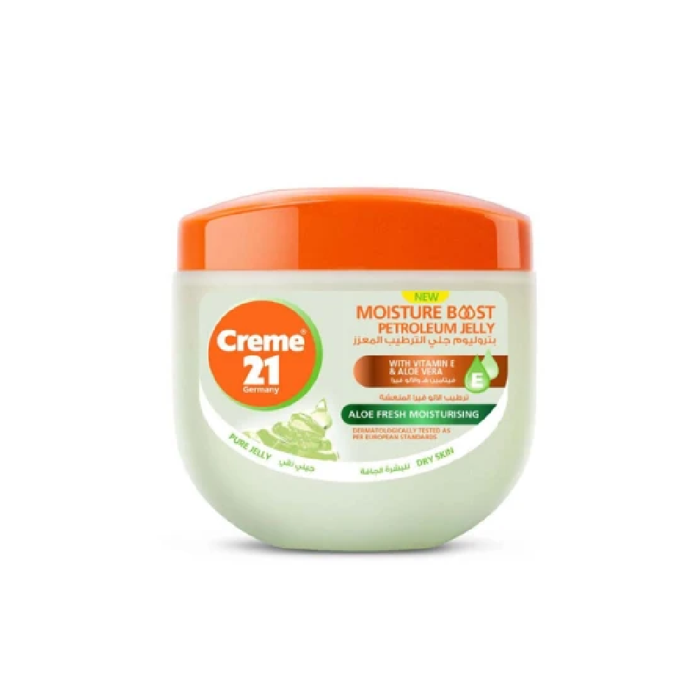 احصلي على الترطيب والتغذية المثالية لبشرتك مع كريم 21 بتروليوم جلي! هذا الكريم متعدد الاستخدامات غني بفيتامين E وخلاصة الألوفيرا ليمنحك بشرة ناعمة، مرطبة، ومحمية من العوامل الخارجية. تركيبته الفريدة تحتوي على بتروليوم جلي الذي يشكل حاجزاً على سطح البشرة للحفاظ على الترطيب، مما يعزز تجديد وتغذية البشرة بعمق.