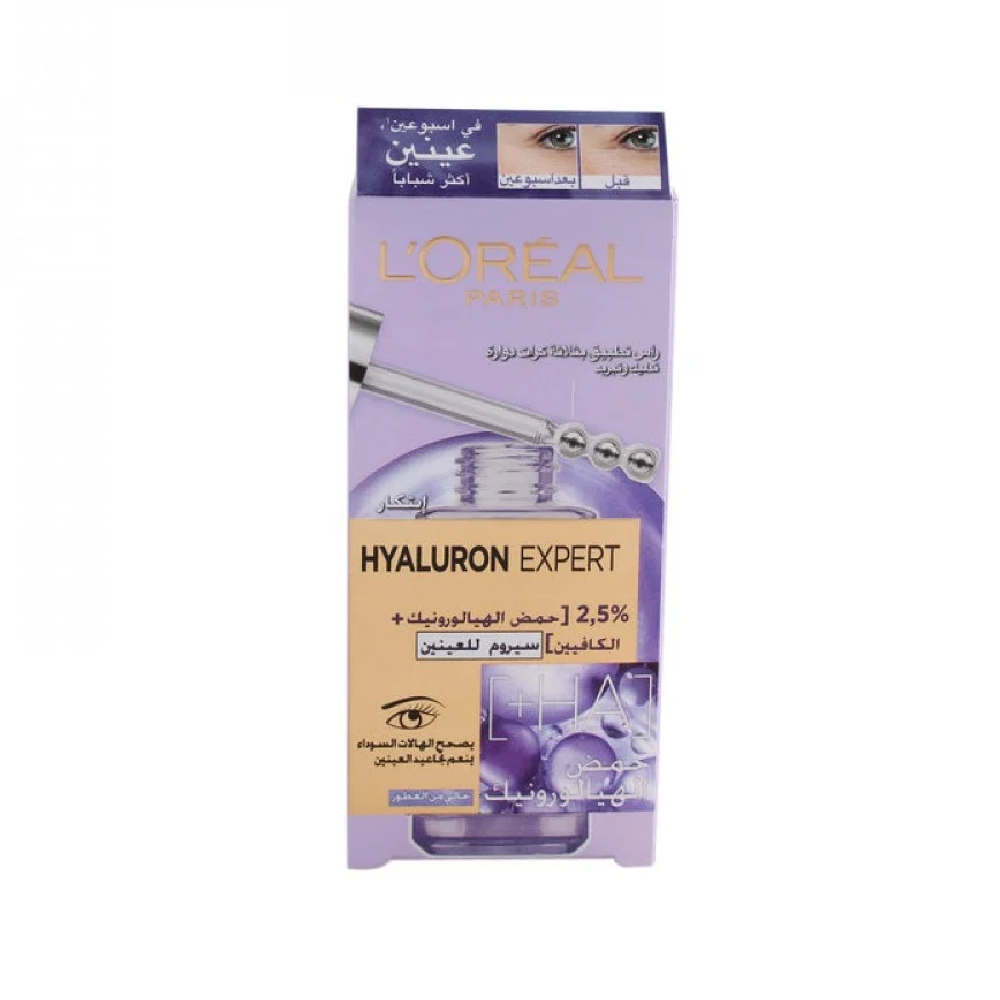 أول مصل مخصص لمنطقة حول العينين من لوريال، يعمل على ترطيب البشرة بعمق وملء الخطوط الدقيقة بفضل تركيبته المميزة من حمض الهيالورونيك النقي. يساعد هذا المصل أيضًا في تقليل الهالات السوداء بفضل احتوائه على الكافيين النقي، بالإضافة إلى تنشيط البشرة بفضل مزيج من النياسيناميد وفيتامين سي جي.