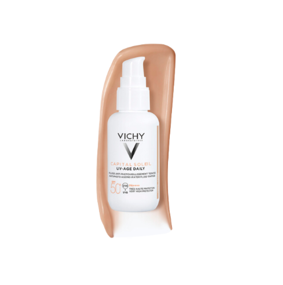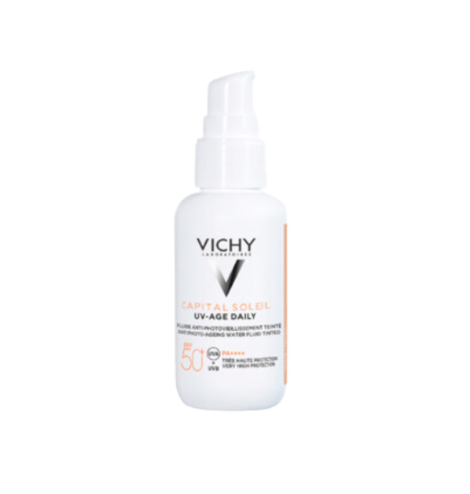 سائل واقي للشمس بتركيبة قوية تجمع بين مياه فيشي البركانية وكسور البروبيوتيك والبيبتيدات والنياسيناميد لمكافحة علامات الشيخوخة الضوئية. تحتوي على صبغة تنعيم عالمية.